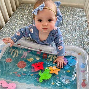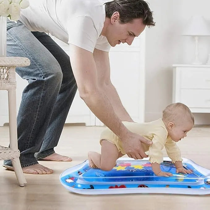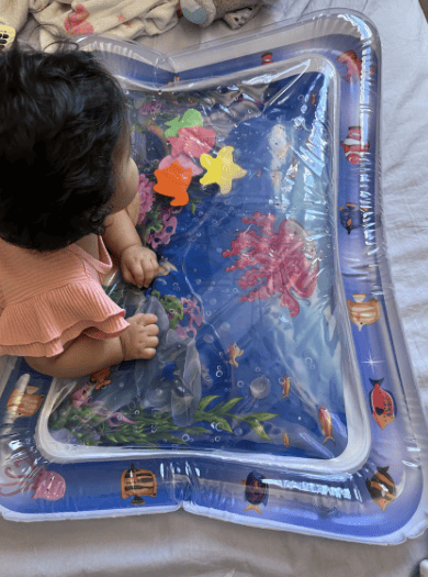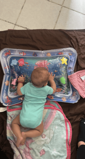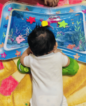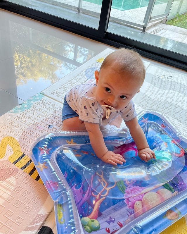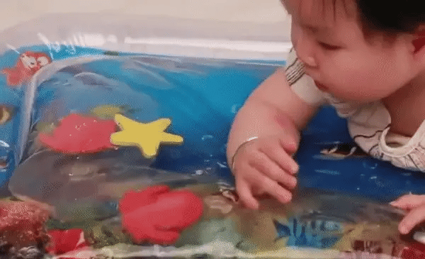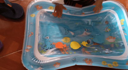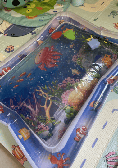 Solo necesitas inflar los bordes con aire y llenar el centro con agua. Coloca el tapete en una superficie plana y segura, pon a tu bebé boca abajo y observa cómo se divierte con los juguetes flotantes.