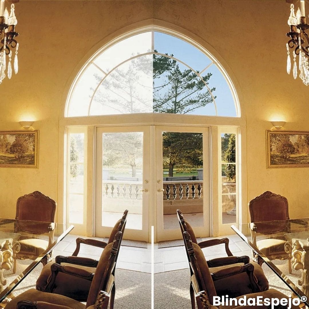 El efecto espejo de BlindaEspejo® transforma el vidrio en un escudo que refleja el exterior. Desde fuera, solo se verá un espejo uniforme; desde dentro, tendrás una vista despejada y luminosa.