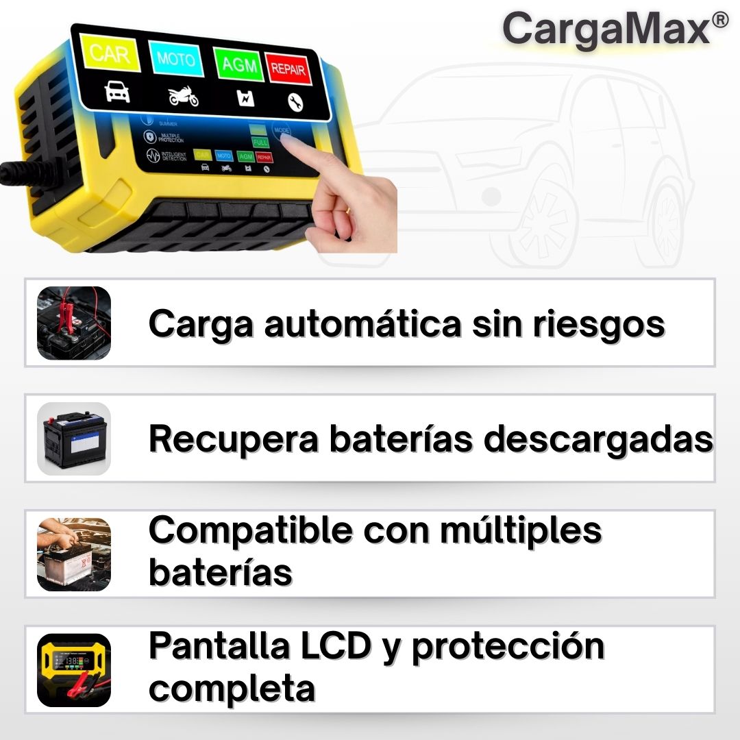 Sí, CargaMax® es compatible con baterías de plomo-ácido, AGM, GEL, EFB y calcio de 12V, que son las más comunes en autos, motos, camiones, botes y otros vehículos.