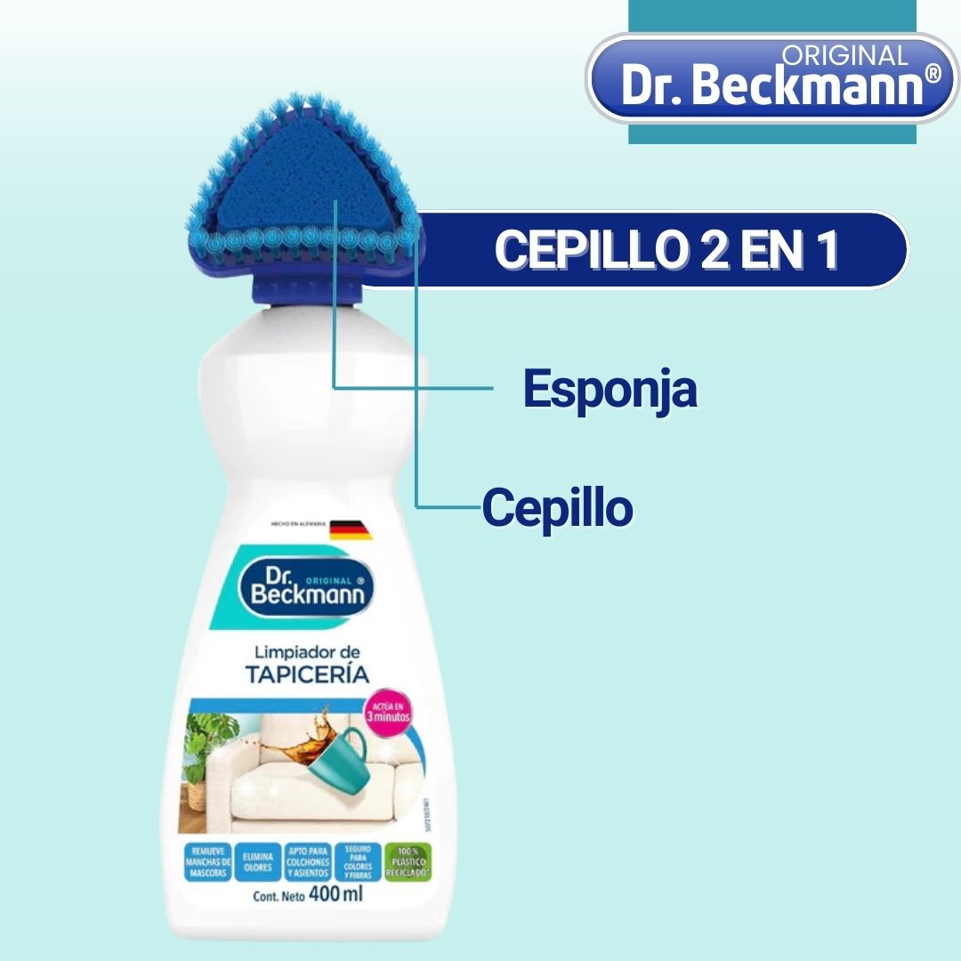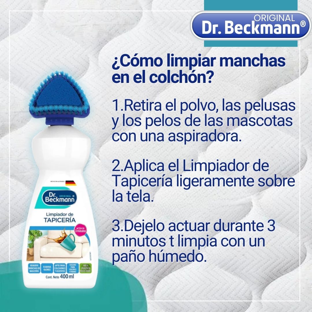 Dr.Beckmann® elimina el problema desde el origen. Su fórmula con oxígeno activo penetra profundamente en las fibras, descompone la suciedad incrustada y neutraliza los malos olores, dejando el tejido limpio, fresco… y con una apariencia tan renovada que parece recién comprado.