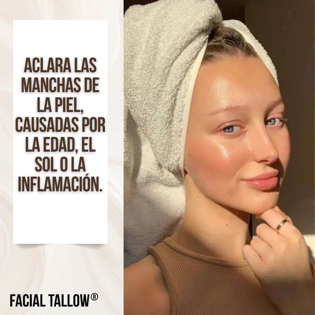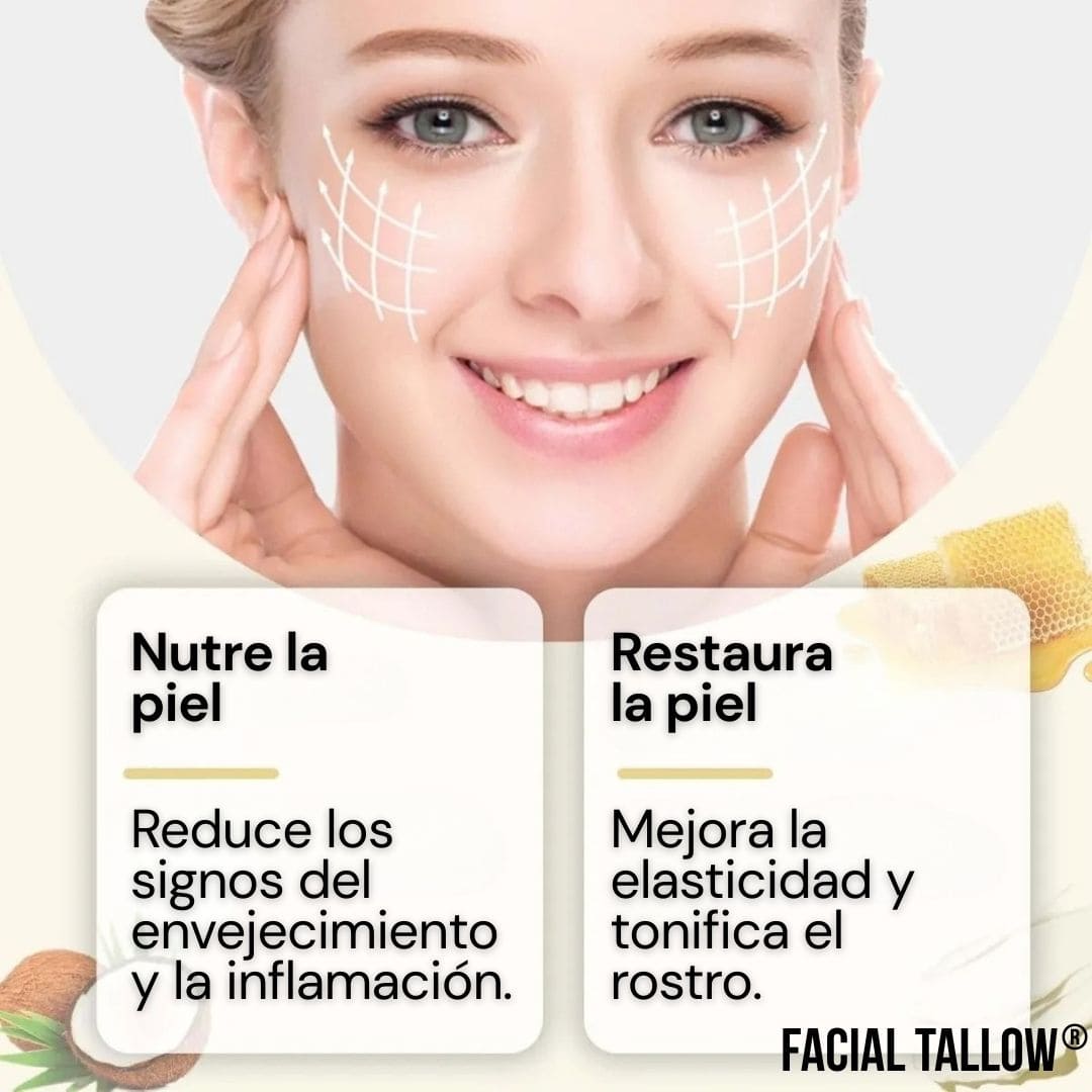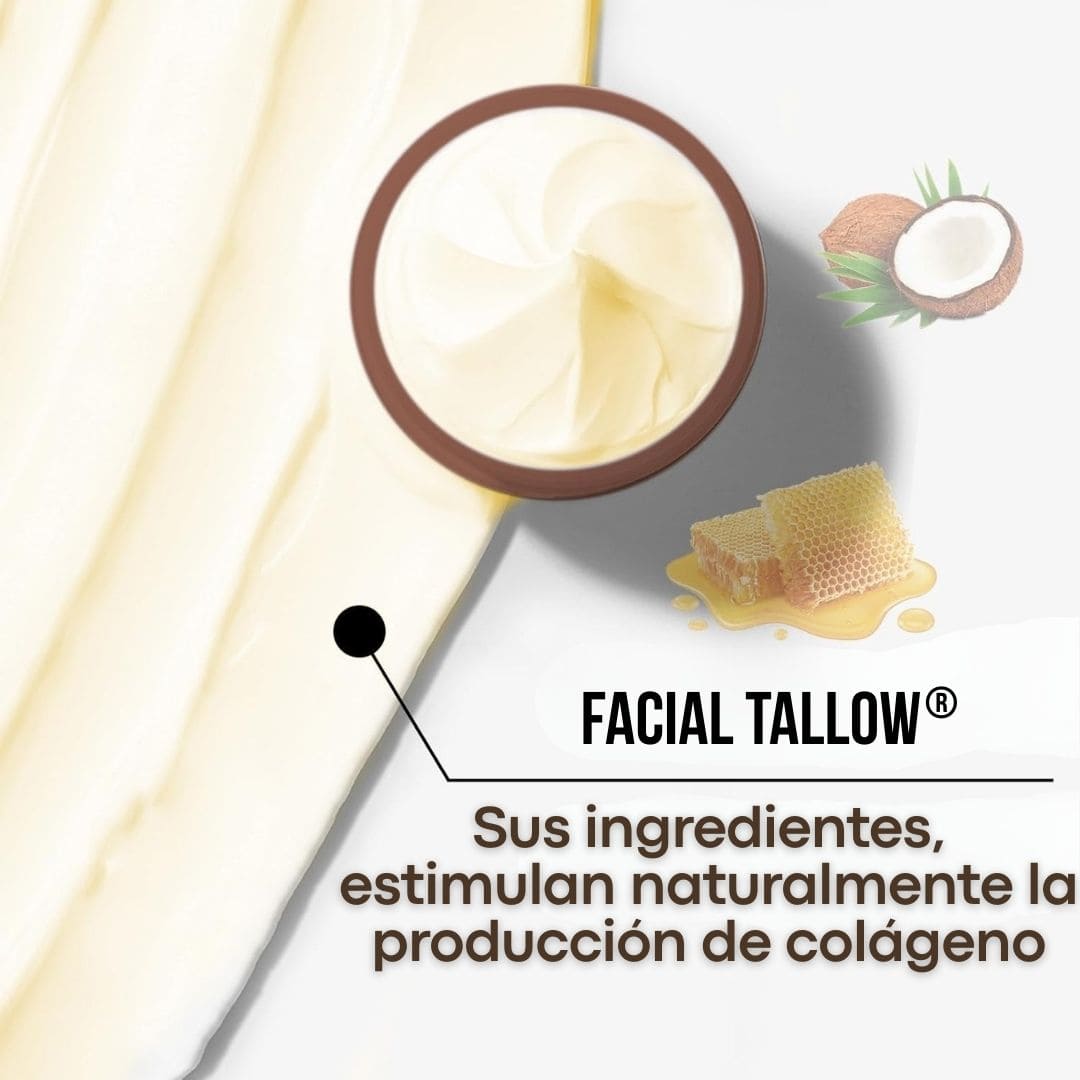 FACIAL TALLOW® reduce arrugas, manchas y flacidez desde adentro con ingredientes que tu piel reconoce: sebo natural, miel y vitaminas que restauran firmeza y brillo sin dañar.
