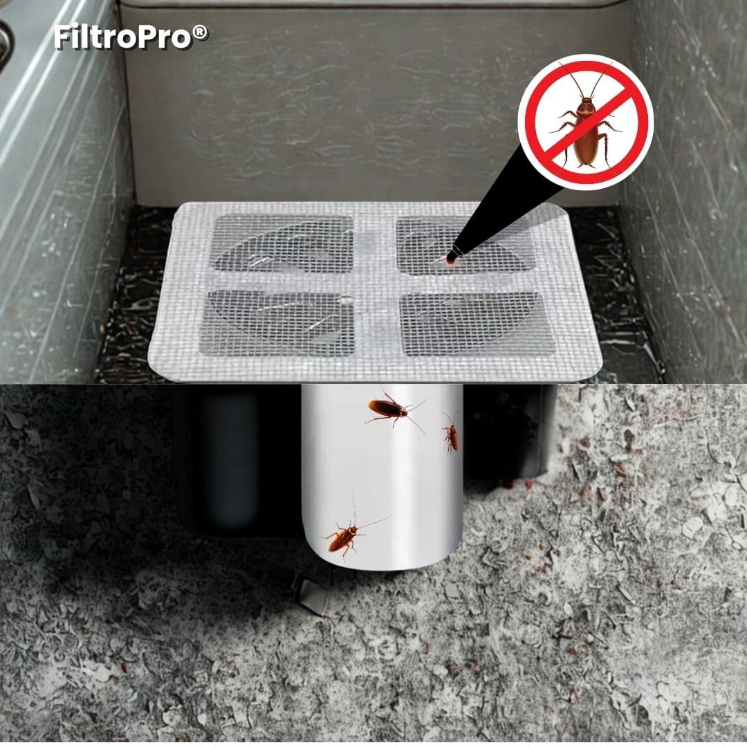 FiltroPro® con malla ultrafina que no solo atrapa cabello y comida, sino que bloquea físicamente el paso de cualquier insecto desde el desagüe.