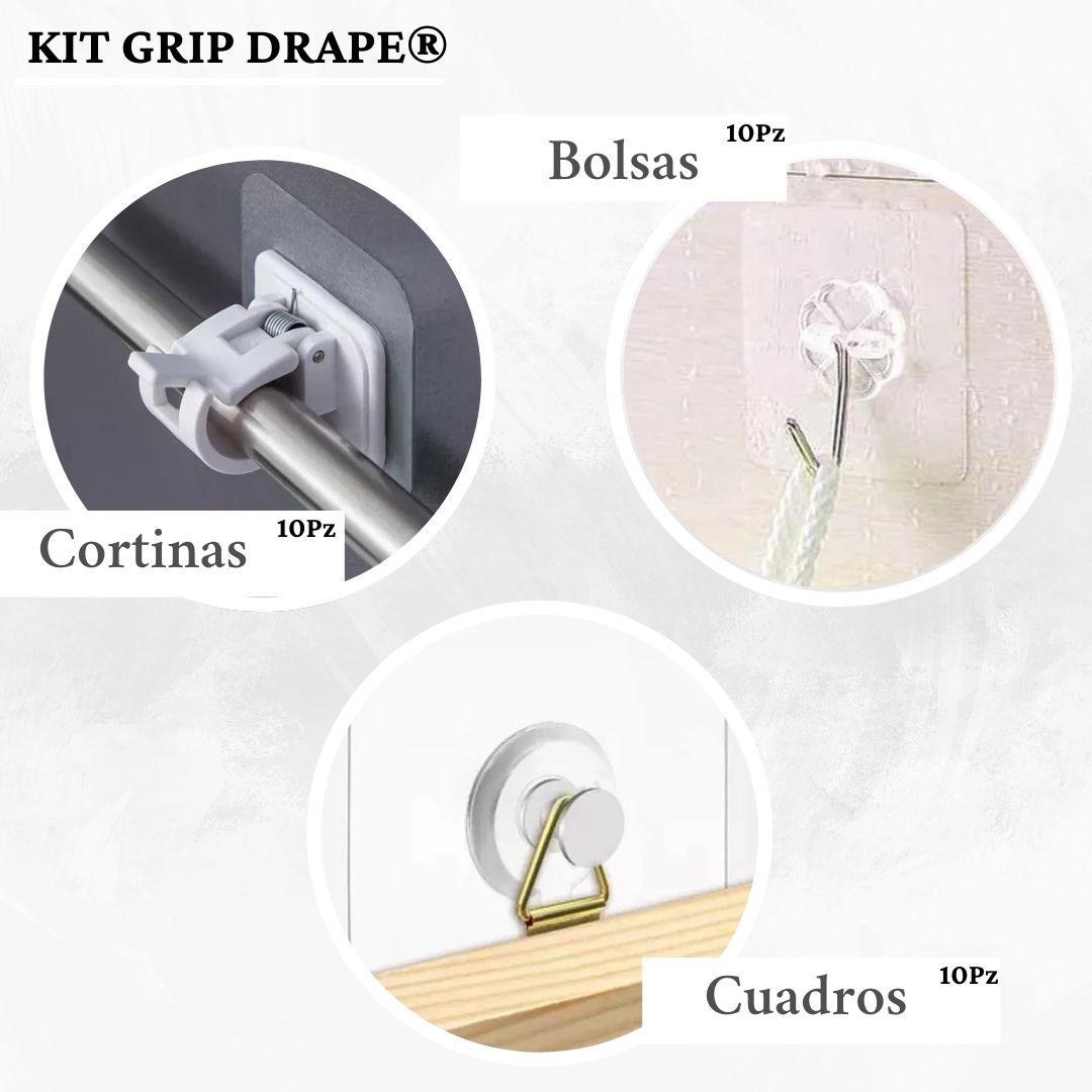 Kit Grip Drape® te permitirá rediseñar tus espacios en cuestión de segundos, sin clavos, martillos, sin riesgos ni complicaciones, sólo oprimiendo el adhesivo durante 6 segundos.