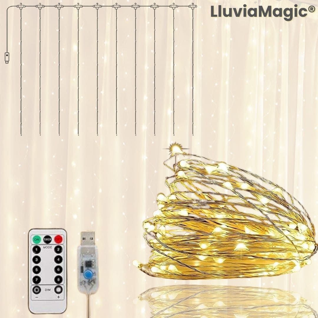 LluviaMagic® tiene un sistema práctico y seguro; bajo voltaje por USB, tiras de luz integradas que iluminan de manera uniforme y un controlador que permite proyectar distintos efectos de iluminación; transformando ambientes mágicos que realzan la belleza en cualquier lugar.