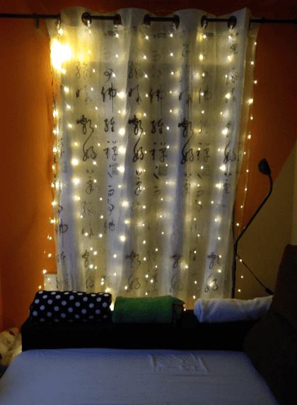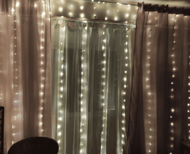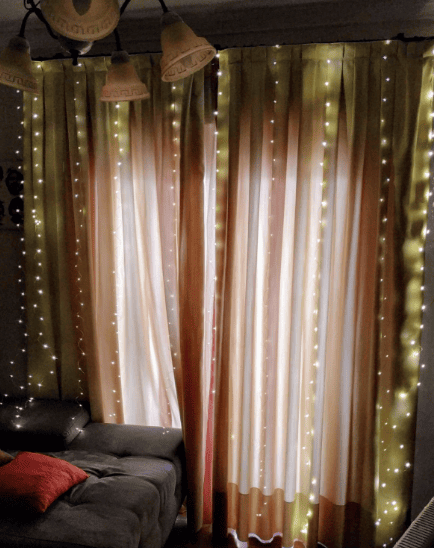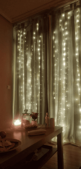 • Me gustan las luces, son fácil de instalar y vienen con pequeños ganchos que puedes colgar en la parte superior de la cortina.