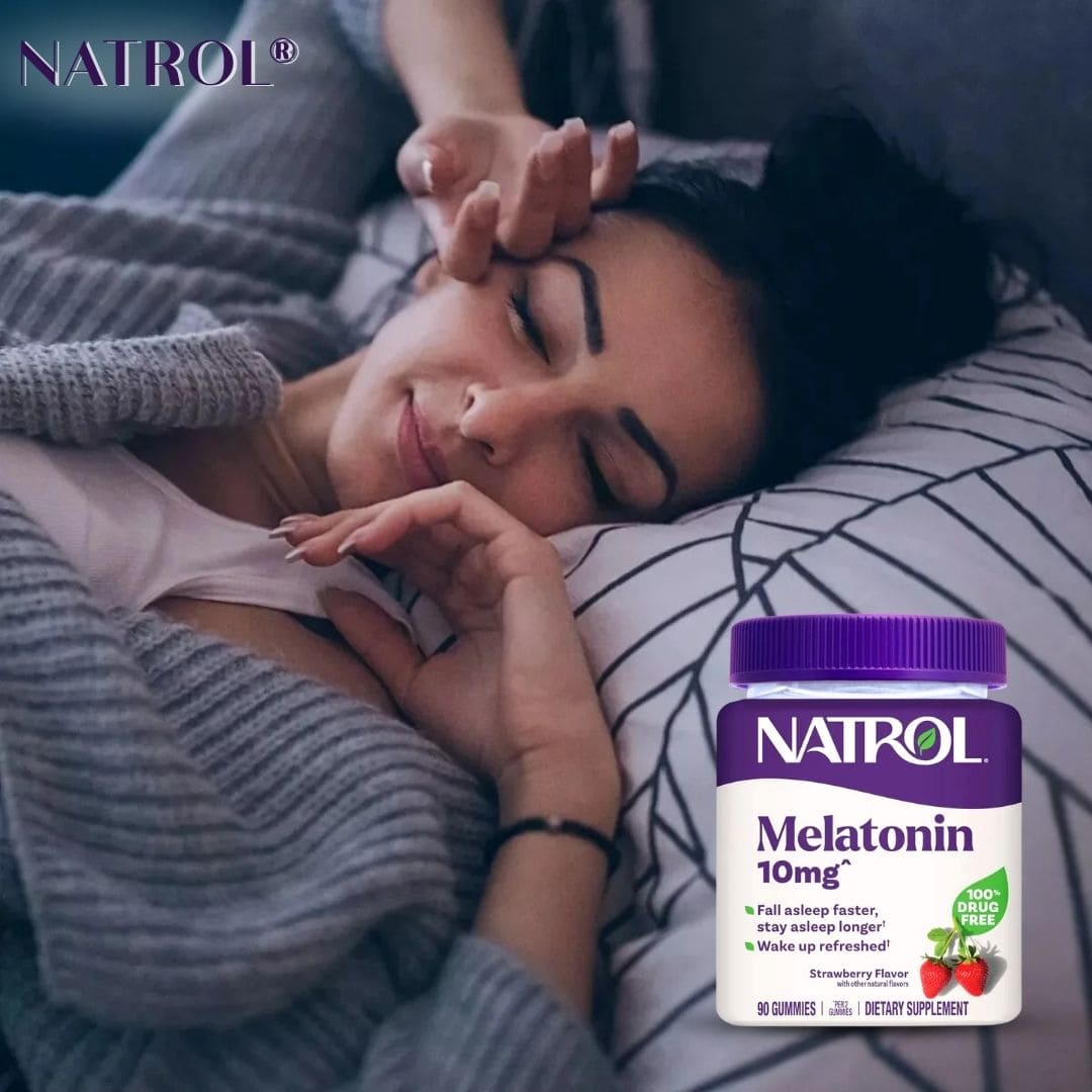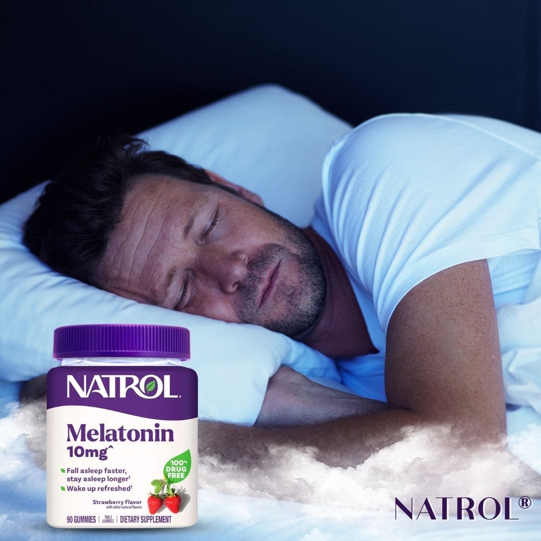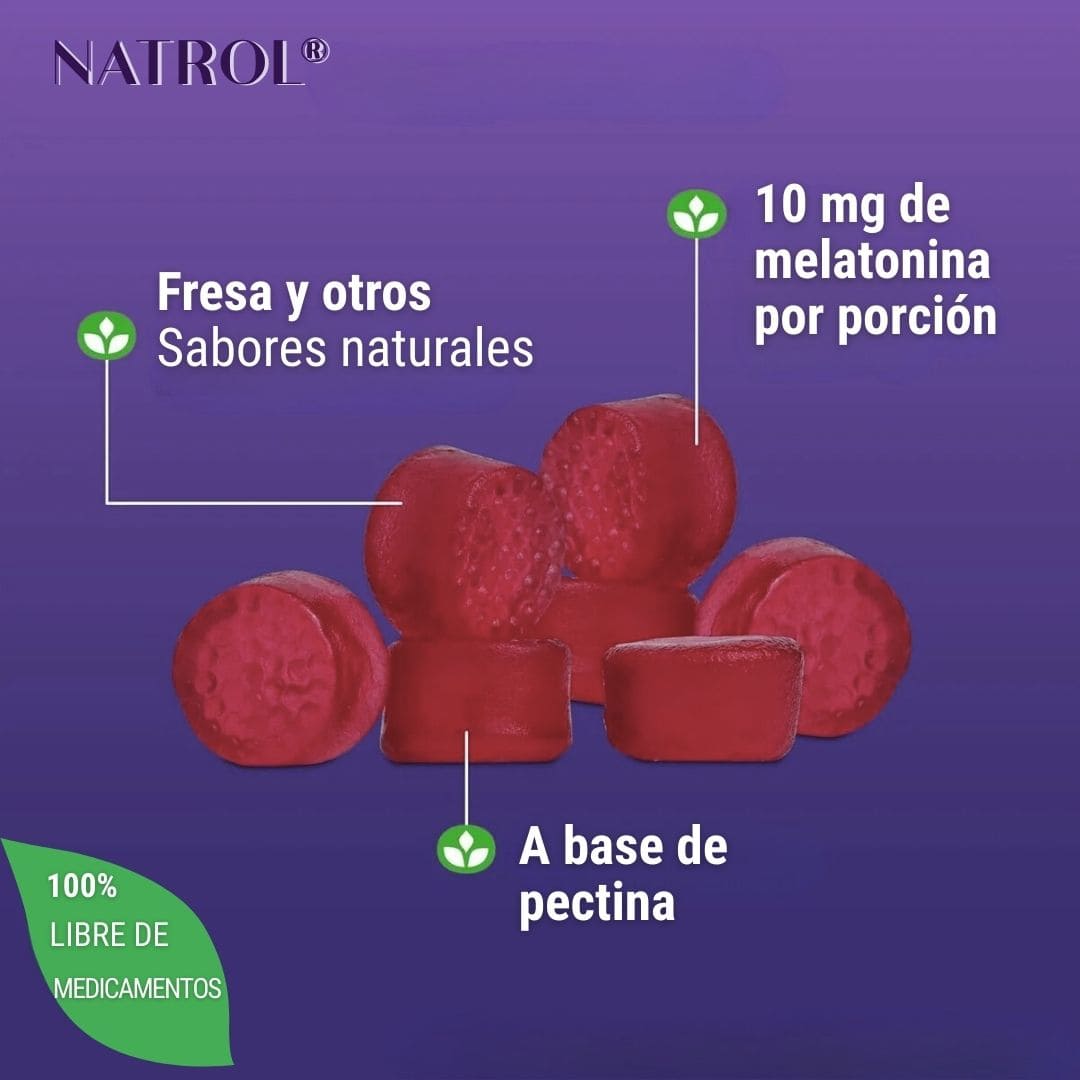 Las gomitas Natrol® trabajan con tu reloj biológico para restablecer la regularidad de tu sueño. Con solo 2 gomitas antes de dormir entrenas a tu sistema nervioso para descansar de verdad.