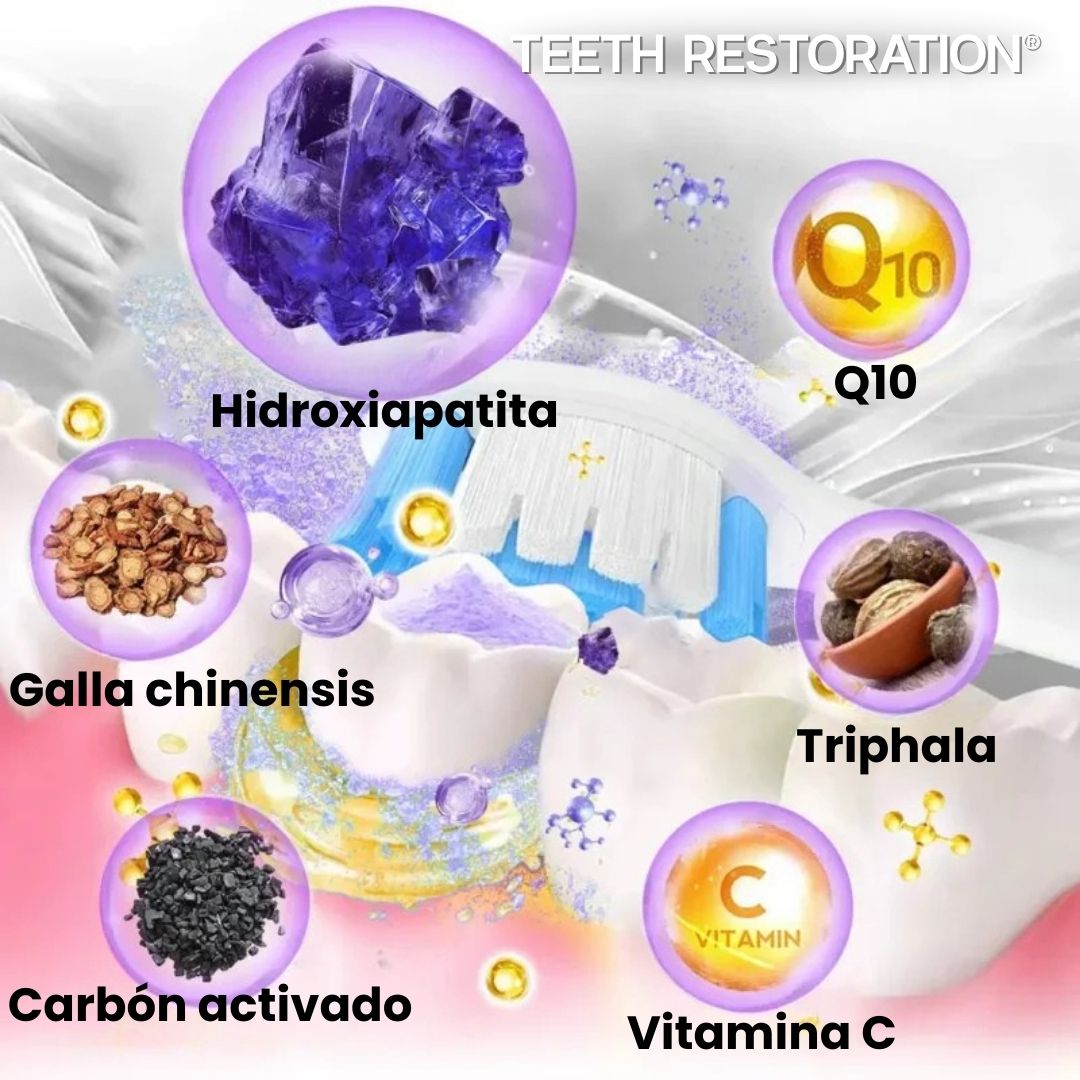 TEETHRESTORATION® ha sido formulado para transformar por completo la salud de tu boca. Su base de minerales naturales como hidroxiapatita, calcio y fosfato actúa directamente sobre las zonas debilitadas del esmalte, penetrando en micro fisuras invisibles para fortalecerlo desde adentro. Este proceso ayuda a restaurar la estructura dental, reducir la sensibilidad y devolver a tus dientes su apariencia suave, fuerte y naturalmente blanca. A diferencia de los blanqueadores agresivos, este polvo no erosiona tu esmalte: lo reconstruye.