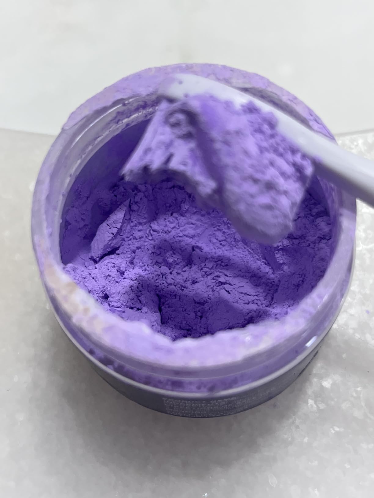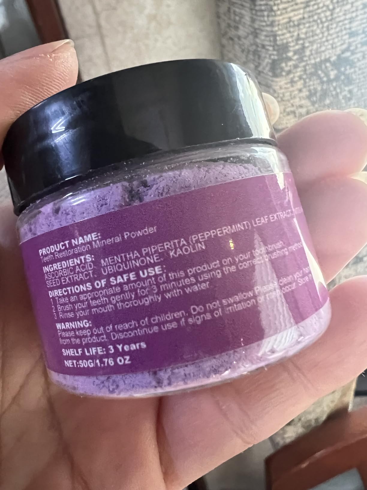 • El sabor es muy suave, a menta. El polvo es fácil de usar, pero el colorante morado se esparce por todas partes si no tienes mucho cuidado. Mis dientes se sienten bastante limpios después de usarlo.